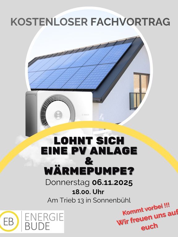 Am 06.11.2025 um 18 Uhr zeigen wir dir in unserem ENERGIEBUDE-Fachvortrag, wann sich eine PV-Anlage wirklich rechnet – und worauf du achten solltest.